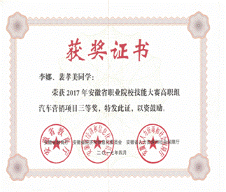 一直以来积极参加市级、院级举办的各项活动,不断提高自己的专业水平。在合肥市职业技术学院第六届大学生职业规划大赛就业组中荣获第三名。另外她吃苦耐劳,值得我们每一个人学习,2017年2月在巢湖亚夏一汽大众4s店见习一个礼拜;2016年12月至2017年3月训练安徽省职业院校高职汽车营销大赛,担任销售顾问的角色。同时作为广播站的负责人之一对待平时的工作也是十分的认真负责,积极完成站里的各项工作,与共事的同学认真沟通,共同进步。