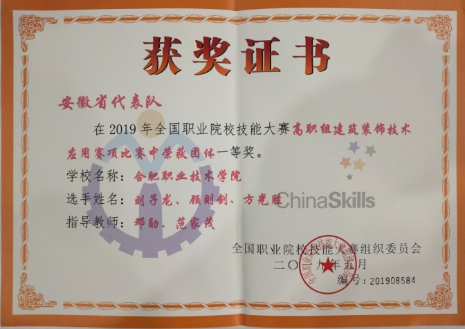 并作为安徽省代表队参加全国职业院校技能大赛高职组“建筑装饰技术应用”赛项并一举获得一等奖的好成绩。而邓勋老师及其团队所付出的艰辛与汗水也是不言而喻的。并且邓勋老师以指导学生参加大赛并获得一等奖为契机,积极总结日常教学改革经验编写材料申报“安徽省高水平技能竞赛教学成果奖”并获得一等奖。