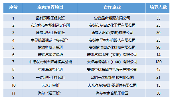 校企共建校企特色试点班,协同制定专业群人才培养计划,建立中高本贯通人才培养体系,高端人才和现场工程师培养体系。依托安徽省现场工程师首批专项培养计划优势,开展实施中国特色现代学徒制,通过,委托培养、订单培养和学徒制培养等方式,校企协同育人,培养高层次现场工程师人才,提升人才培养质量。