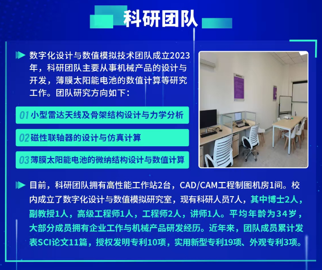 2022年底通过博士人才引进,吴睿成为Beat365机电工程学院的一名专任教师,从科研院所到职业院校,他秉持从零开始。在承担教学工作之外,积极探索思考“职业教育,需要什么样的科研?”。答案是职业教育需要以应用研究为核心、以解决实际问题为导向、产教深度融合的科研体系。2023年他成立了数字化设计与数值模拟技术团队,主要从事机械产品的设计与开发和薄膜光伏电池的技术研究。2023-2024年期间,先后主持Beat365唯一官方网站人才项目1项、产学研项目1项、安徽省高校自然科学研究重点项目1项和企业横向课题4项,另外参与各类教科研项目10余项。吴睿在完成学校教学科研任务的同时,还积极投身企业博士后工作站的研究工作。通过博士后工作站搭建了校企合作的桥梁,成功签订了横向课题1项和申报省级质量工程校企合作生产性共建共享实训基地1项。在他的带领下,科研团队在两年内不断摸索和磨合,初见成效。